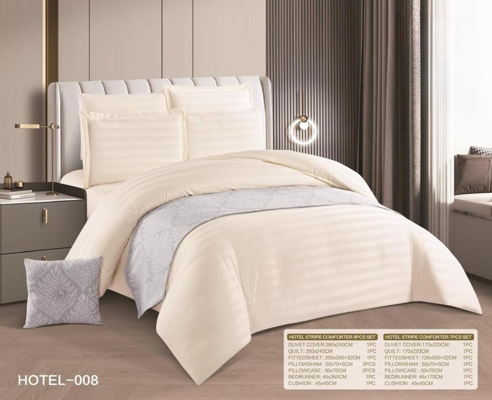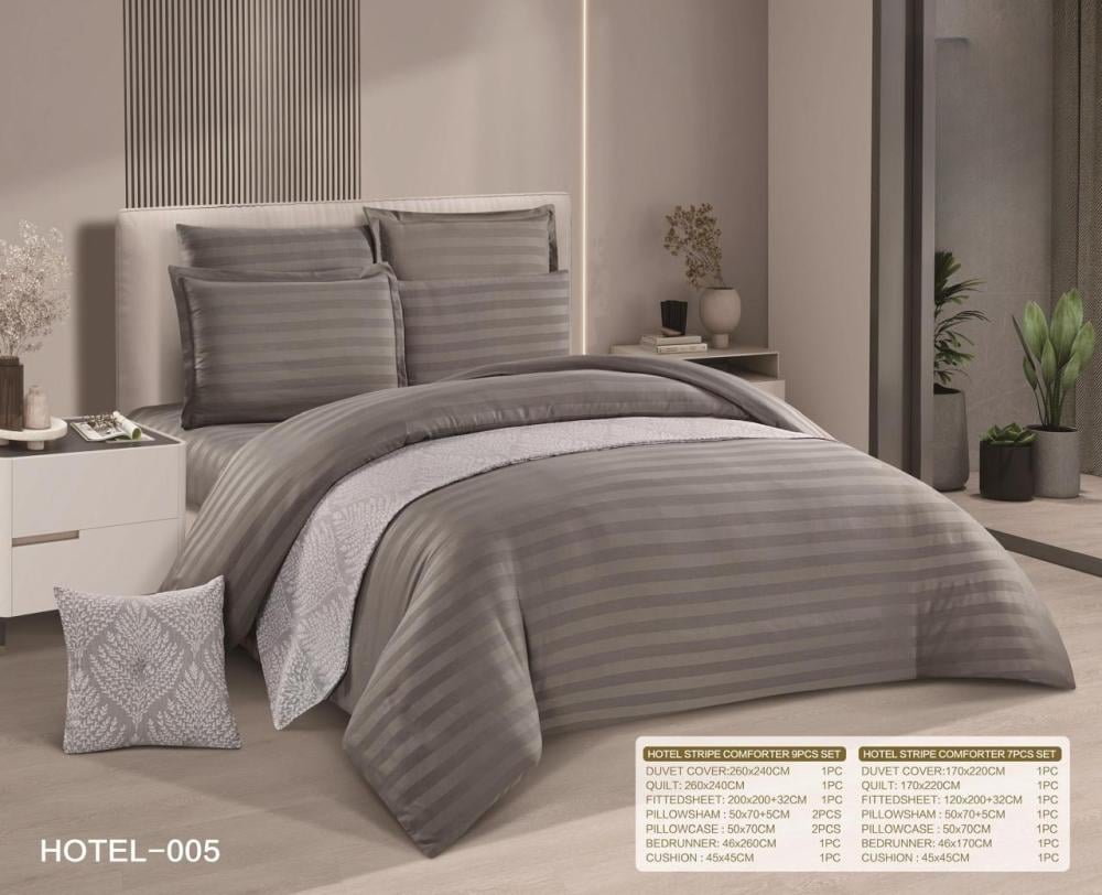 استمتع بتجربة نوم راقية مع طقم HOTEL NAJMA المصنوع بجودة عالية وخامة ثقيلة توفر الراحة والدفء، مع تصميم أنيق ونظام حشوة متحركة لسهولة العناية.