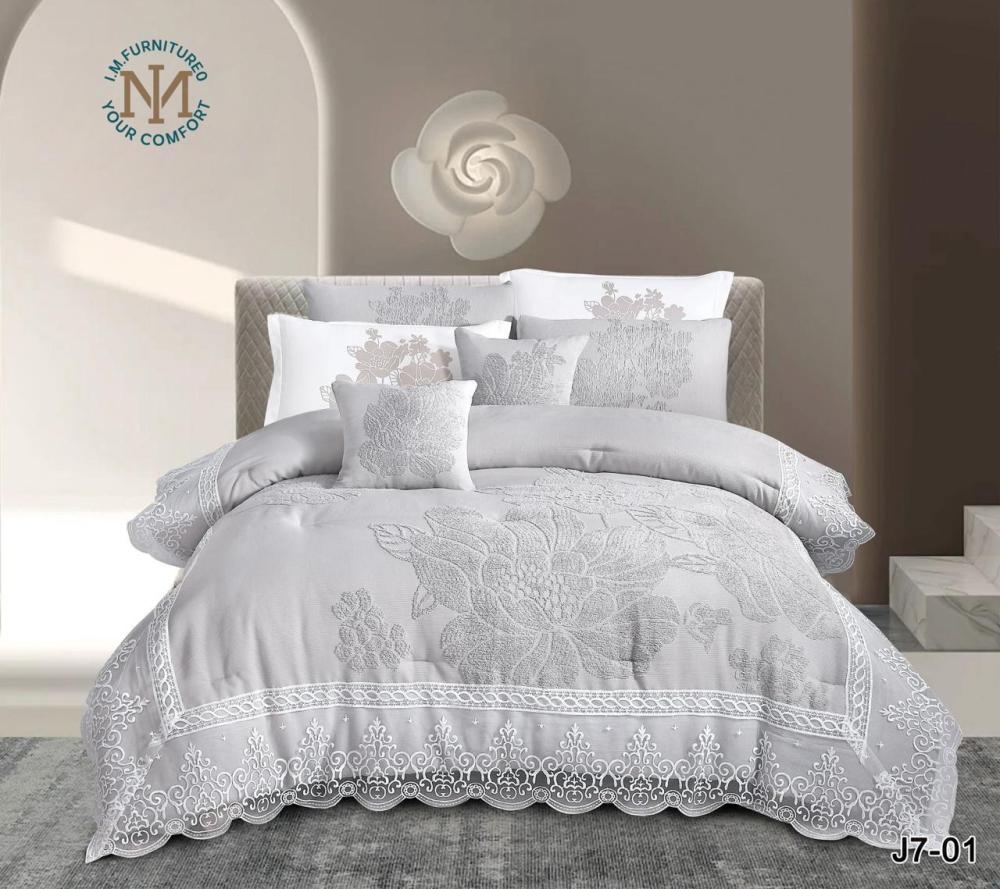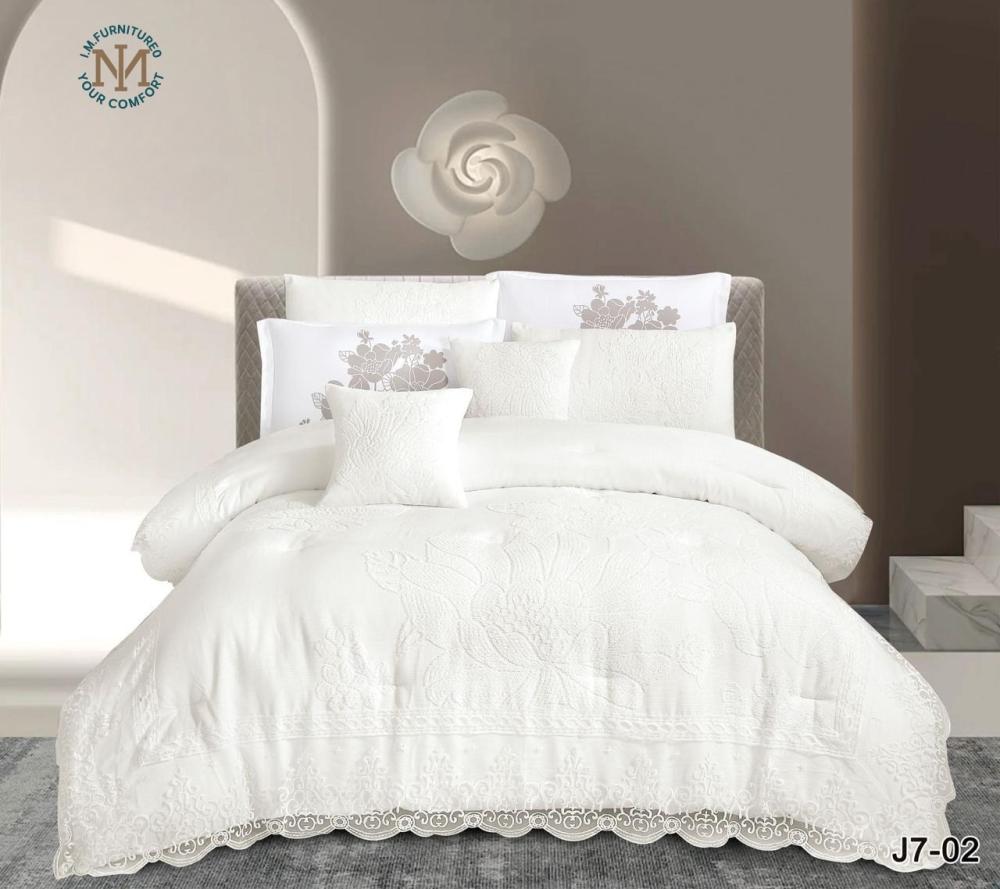 مفرش جوزيل العرائسي هو الاختيار المثالي لكل عروس تبحث عن الفخامة والراحة في آنٍ واحد. تصميم أنيق ومطرز بدقة عالية يضفي لمسة من الرقي على غرفة النوم ويحوّل السرير إلى لوحة فنية تنبض بالنعومة والجمال. خامات فاخرة وتفاصيل دقيقة تجتمع في طقم مميز يعكس الذوق الرفيع.